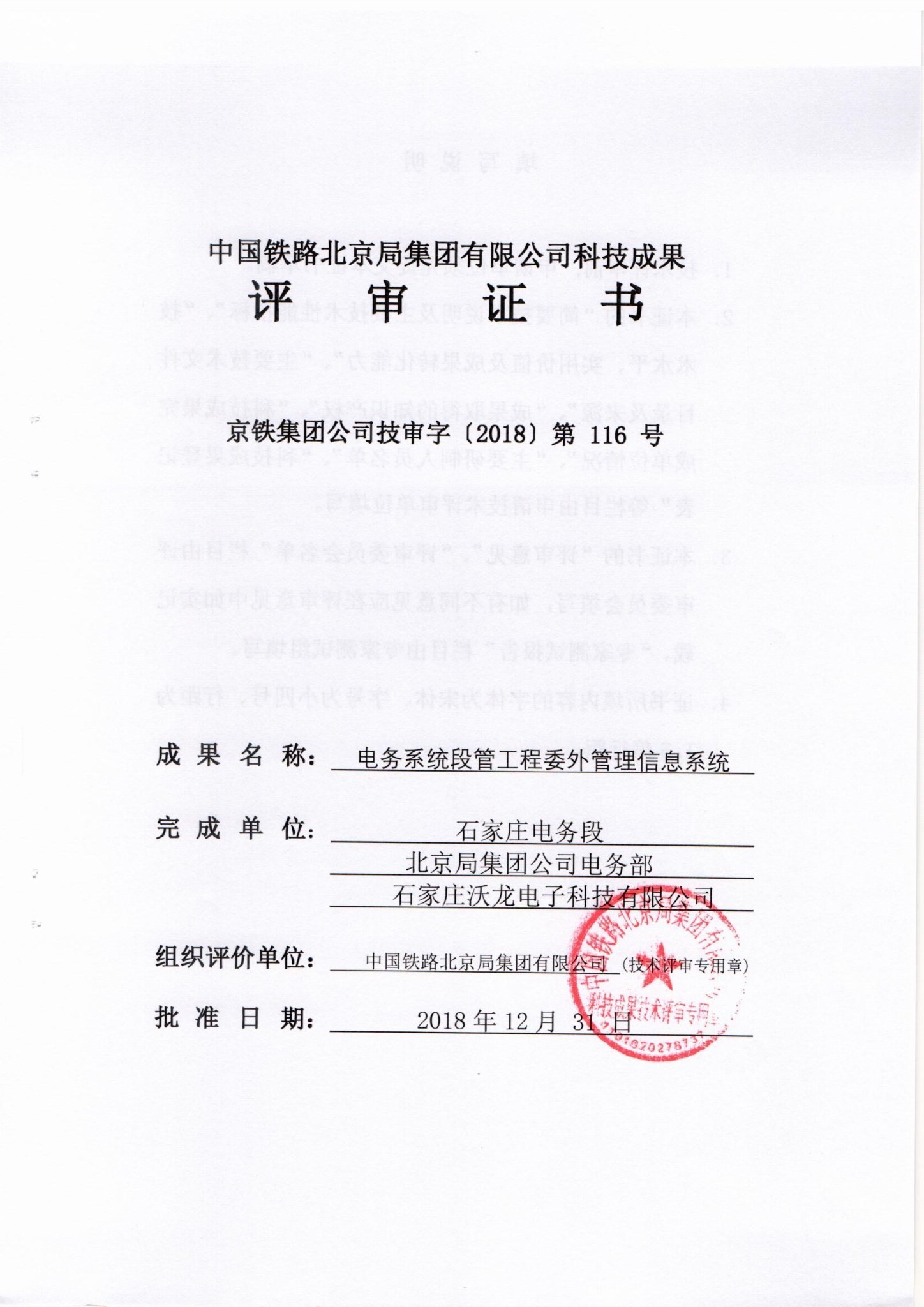 2018年12月28日,我司“电务系统段管工程委外管理信息系统”课题通过了中国铁路北京局集团有限公司科学技术委员会技术评审,评审专家一致认为:该系统达到国内领先水平。