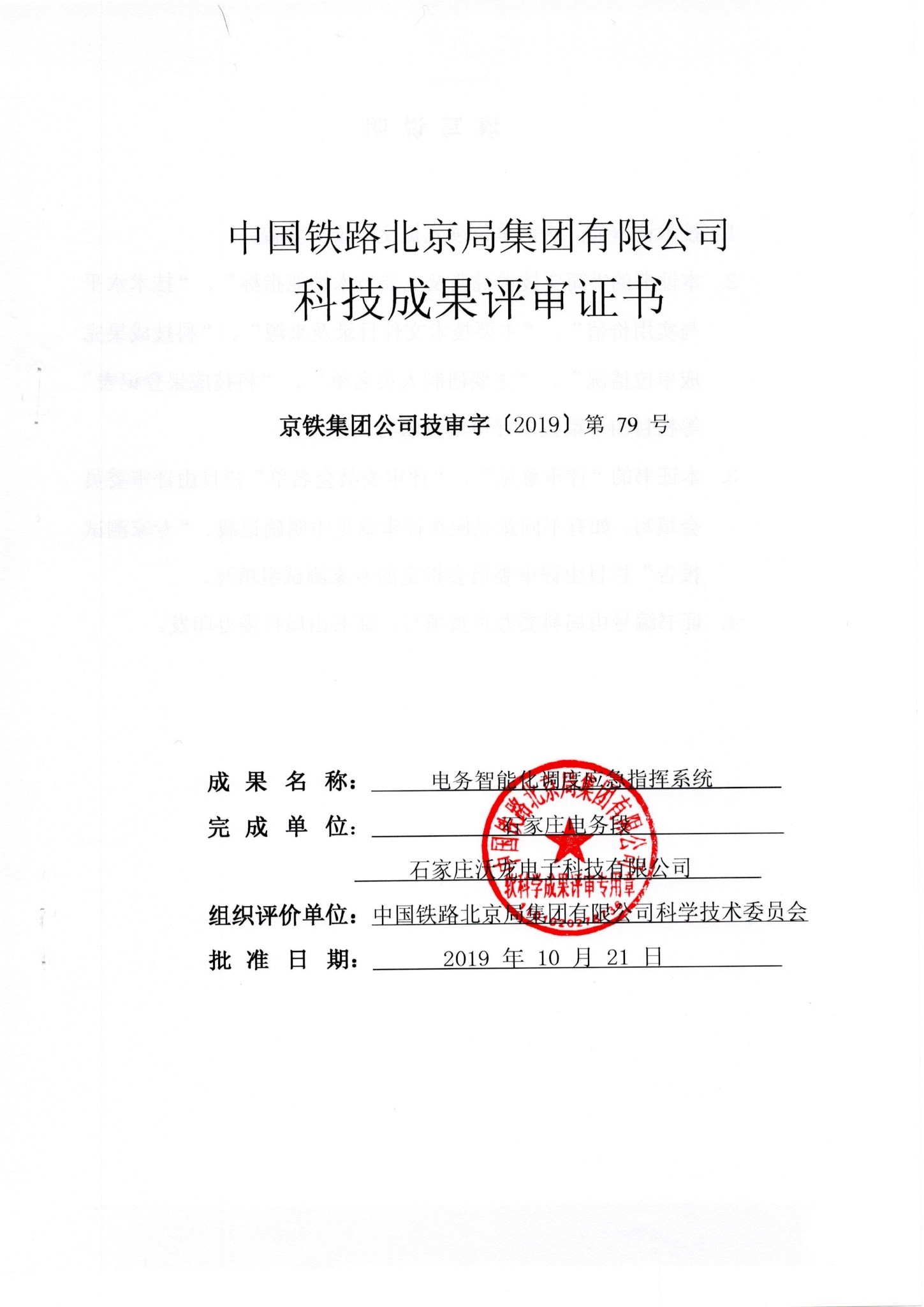 2019年10月21日,“电务智能化调度应急指挥系统”课题通过了中国铁路北京局集团有限公司科学技术委员会技术评审,评审专家一致认为:该系统达到路内领先水平。